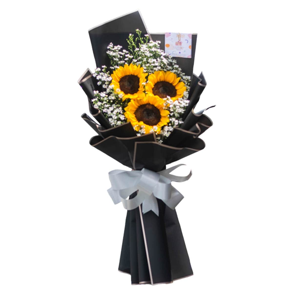 A charming bouquet featuring three vibrant sunflowers surrounded by delicate white aster fillers, beautifully wrapped in sleek black paper and finished with an elegant white ribbon perfect for bringing warmth and joy to someone’s day.