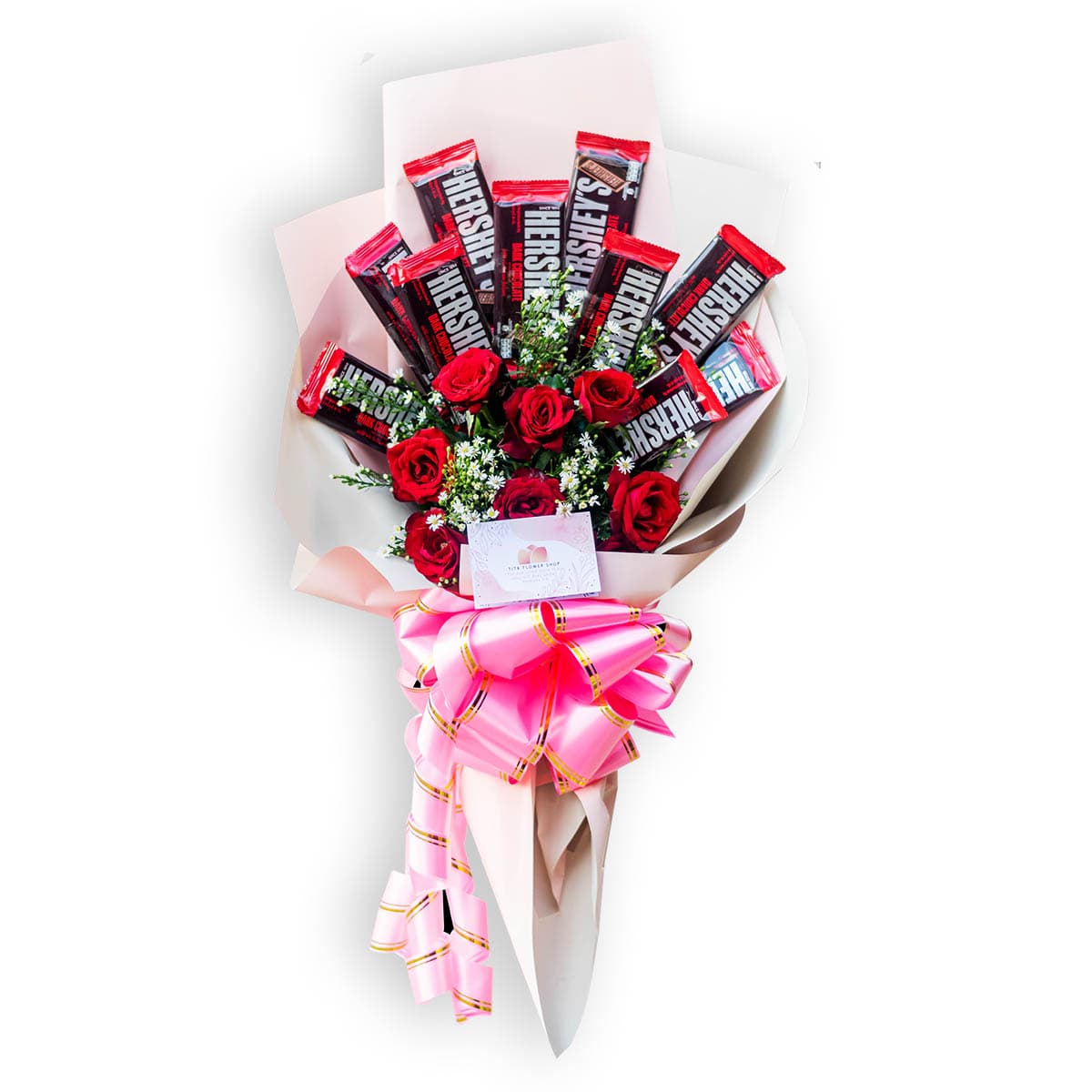 This stunning bouquet is a sweet serenade of romance, featuring a charming arrangement of fresh red roses and delicate white aster fillers, elegantly paired with an irresistible selection of Hershey’s chocolate bars, all beautifully wrapped in soft blush paper and finished with a luxurious pink ribbon.